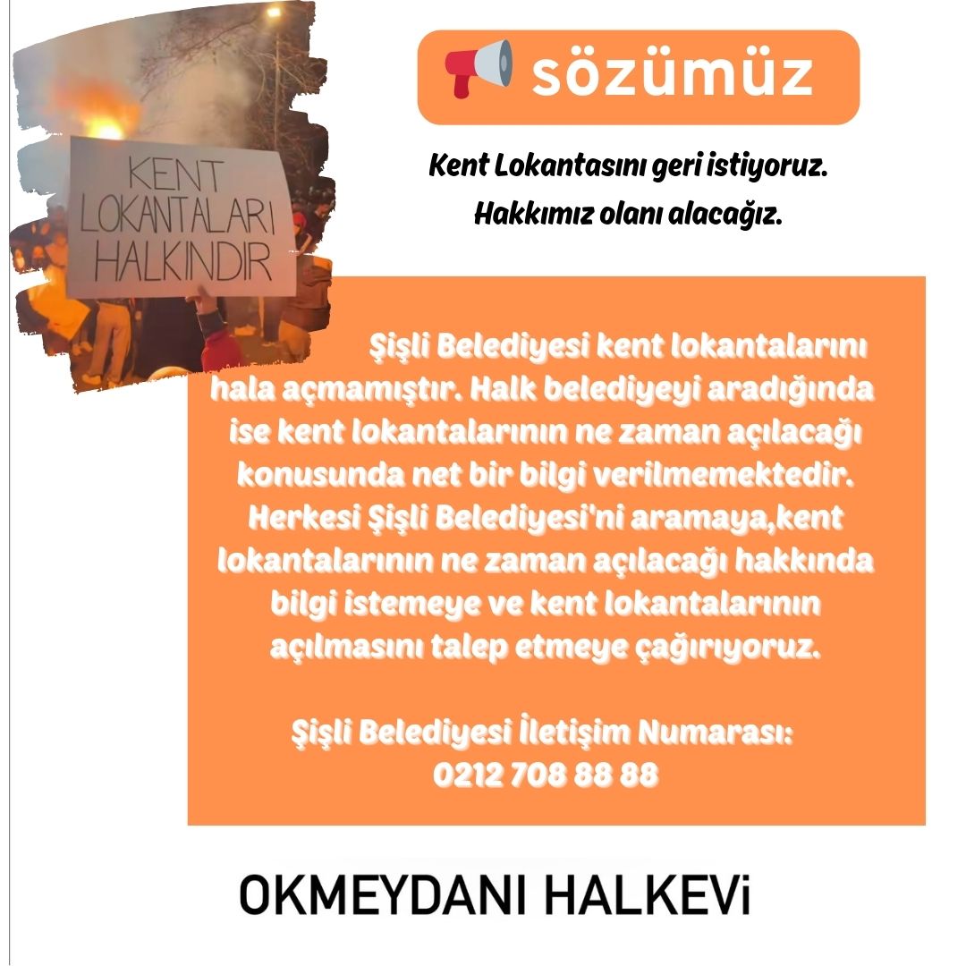 Okmeydanı Halkevi, yaptığı paylaşımla herkesi Şişli Belediyesi’ni arayarak kent lokantalarının ne zaman açılacağı hakkında bilgi istemeye çağırdı.