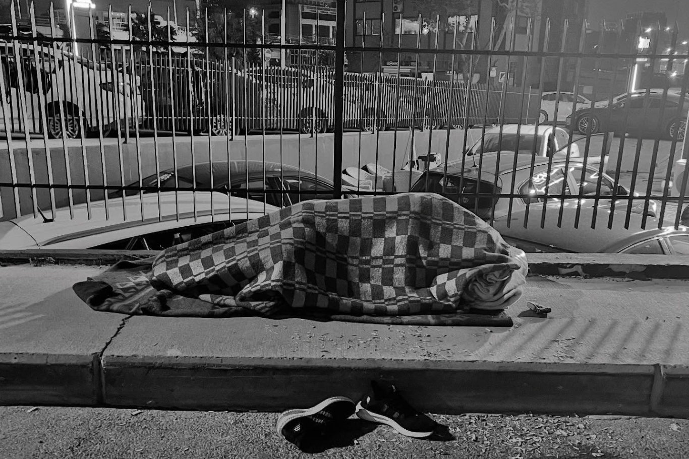 Park etmiş arabaları, pislik içindeki bir sokağı ve sıradan bir kaldırım görüyorsunuz fotoğrafta. Saatin hayli ilerlemiş olduğuna hükmediyorsunuz, zira kimseler görünmüyor ortada; kediler bile kuytulara çekilmiş. Kaldırımda bedeninin hiçbir yeri görünmeyen bir kişi yatıyor, battaniye var üstünde kafasına kadar çekmiş, sokak lambalarının çiğ ışıklarından korunmaya çalışıyor. Sabaha kadar yetim kaldığı anlaşılan siyah spor ayakkabıları adeta terkedilmiş gibi birli birsiz bırakılıvermiş kaldırımın kenarına…