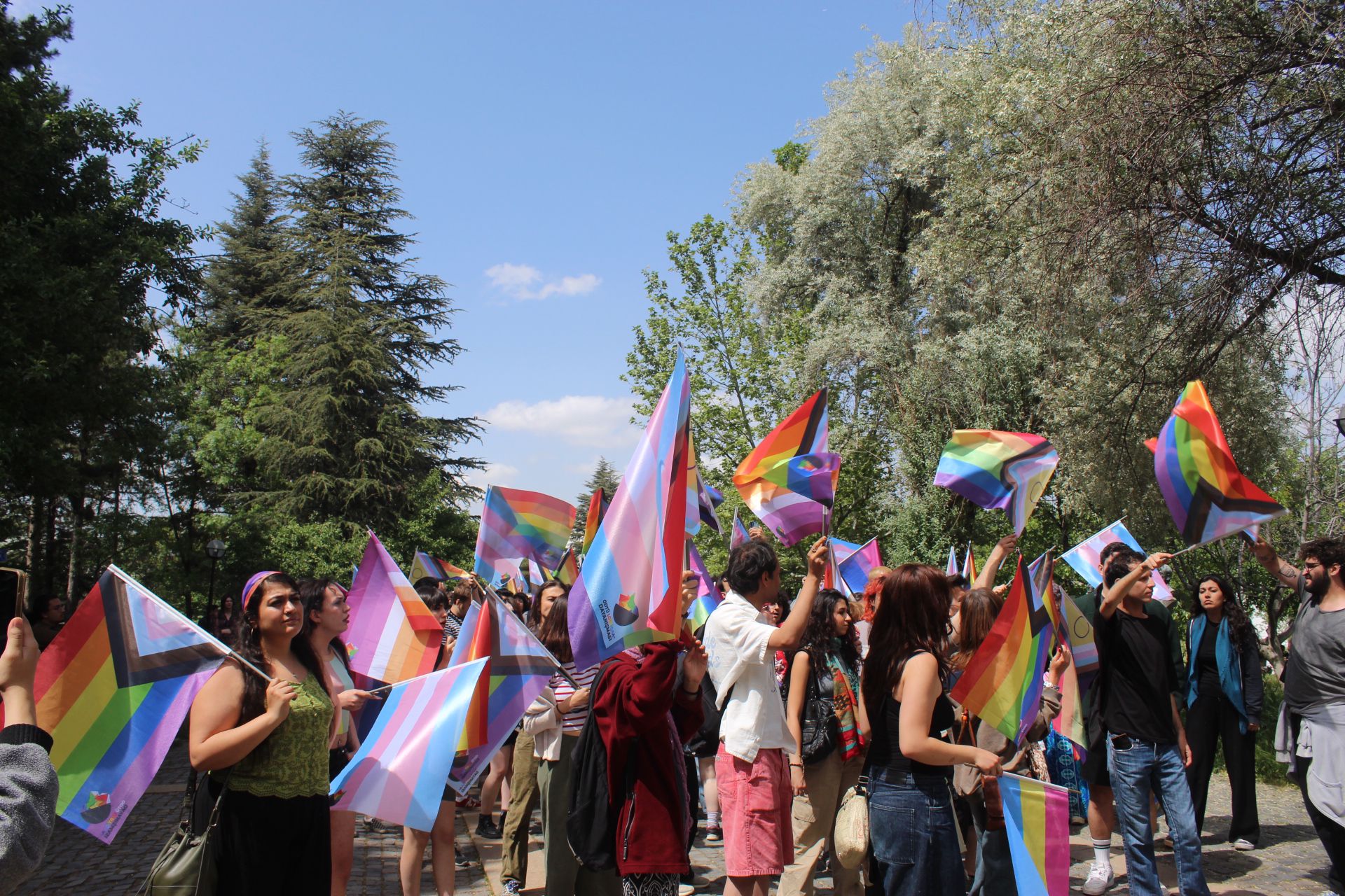 Fizik bölümünün binası önünde bir araya gelen öğrenciler buradan yürüyüşe geçti. Özel güvenliğin engelleme girişimlerini aşan LGBTİ+’lar bayraklarıyla sloganlarıyla yürüdü.