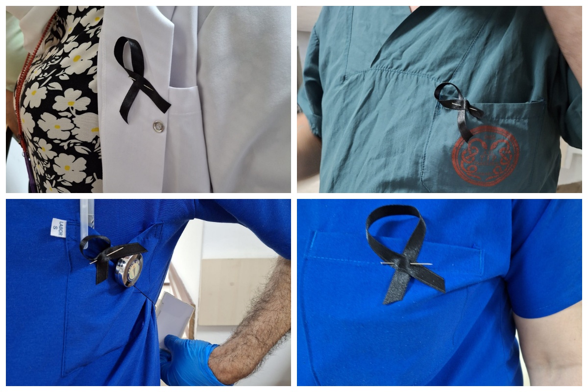 Ankara Üniversitesi Tıp Fakültesi hastanelerinde çalışan sağlık emekçileri artan işyükleri, mobbing, düşük ücretler gibi sorunlarının görmezden gelinmesine dikkat çekmek amaçlı çalışırken yakalarına siyah kurdele taktı
