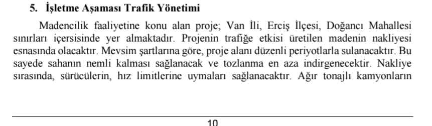 Kapasitenin 2.5 milyon tona çıkarılması izni için yasal olarak valiliğe sunulan proje dosyasının ‘trafik yönetimi’ bölümünde, aynen şu cümleler yazıyor: “Madencilik faaliyetine konu olan proje, Van İli, Erciş İlçesi, Doğancı Mahallesi sınırları içerisinde yer almaktadır. Projenin trafiğe etkisi üretilen madenin nakliyesi esnasında olacaktır.”