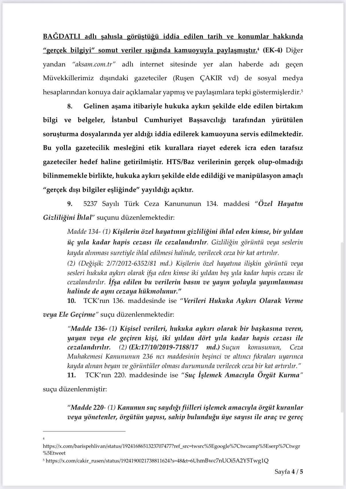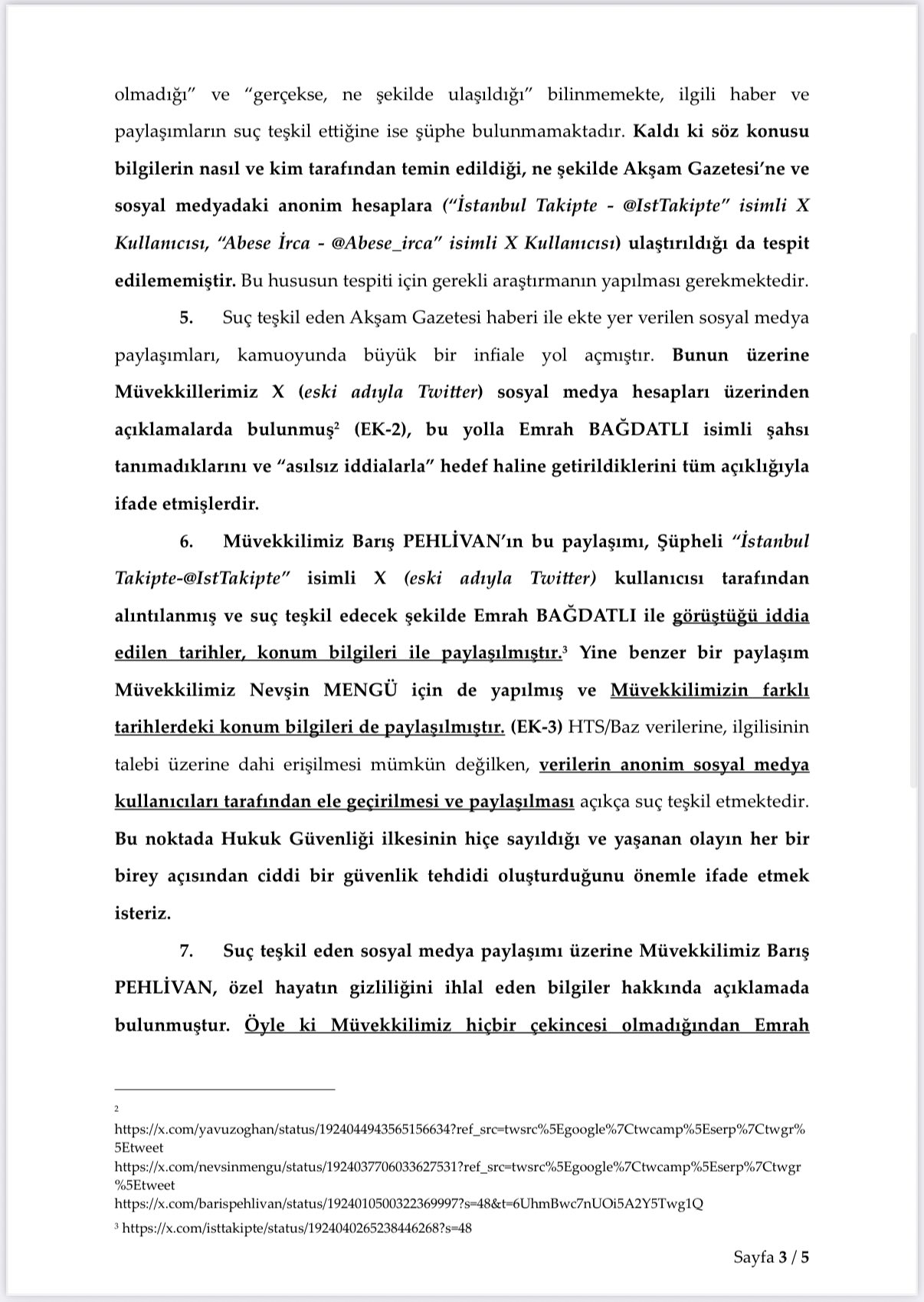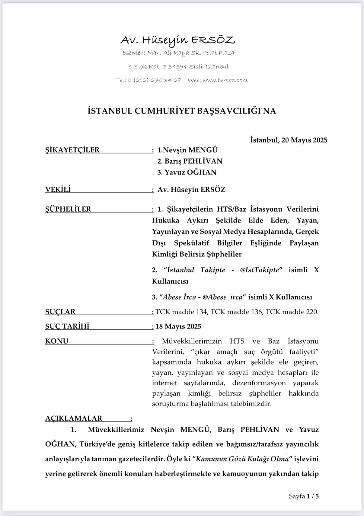 Şikayet dilekçemizde, yasadışı yollarla ele geçirildiğini düşündüğümüz HTS/Baz İstasyonu verileri üzerinden, gerçekdışı ve manüpülatif bilgileri yayan kişilerin kimliklerinin tespit edilerek haklarında soruşturma başlatılmasını talep ettik. Dilekçede bu konunun sadece gazeteci müvekkilerimizin değil, tüm vatandaşların Hukuk Güvenliği’ni ilgilendiren bir boyutunun olduğuna da vurgu yaptık.