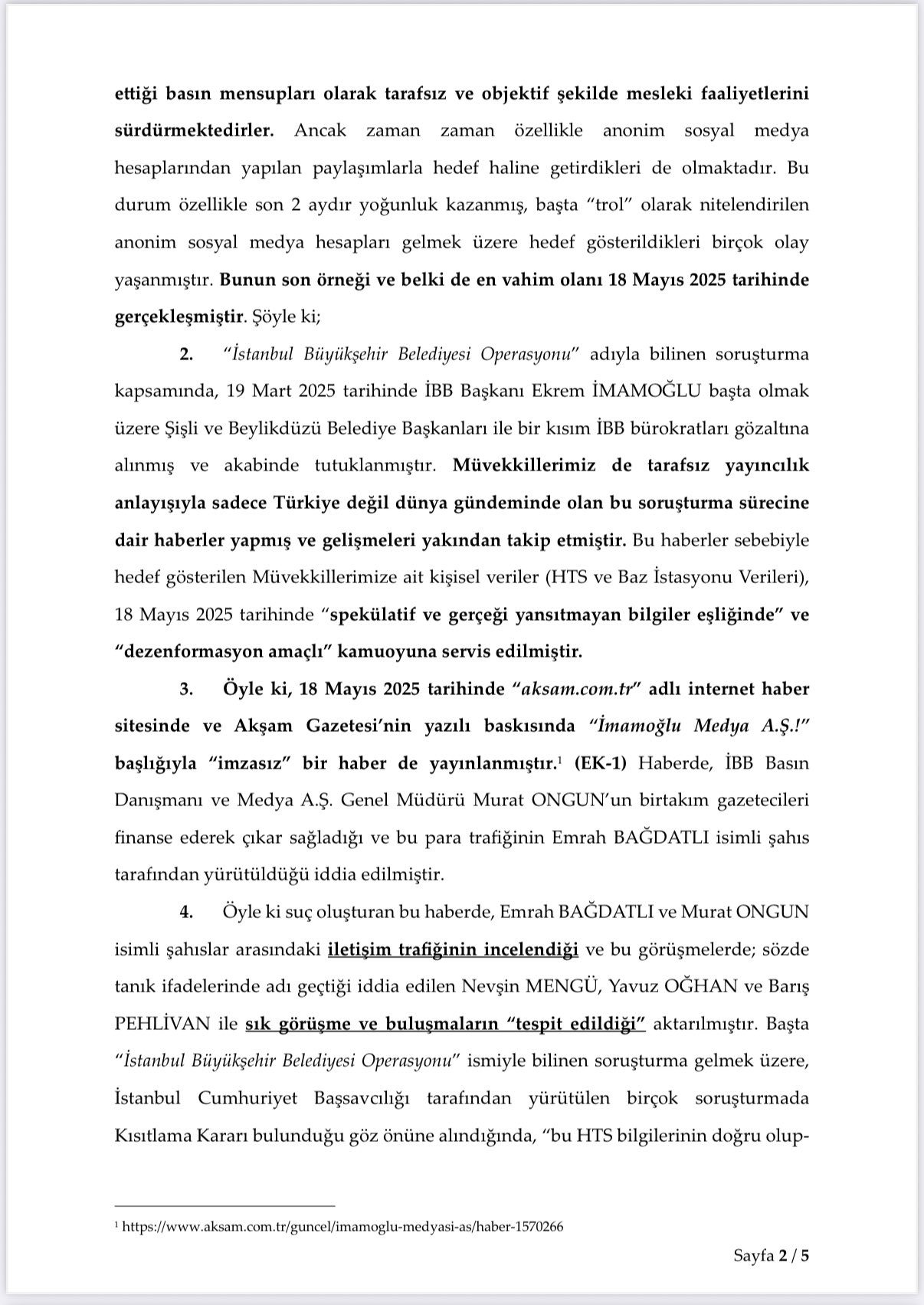 Gazeteciler Yavuz Oğhan, Nevşin Mengü ve Barış Pehlivan, kendileri hakkında Medya A.Ş. Başkanı Murat Ongun tarafından finanse edildikleri yönündeki iddialara yönelik suç duyurusunda bulundu. Akşam gazetesinde yer alan haklarındaki “İBB’yle para trafiği” iddiasına yönelik yapılan suç duyurusunda HTS bilgilerinin doğu olup olmadığı, doğruysa bile yasadışı yollarla edinildiği ifade edildi