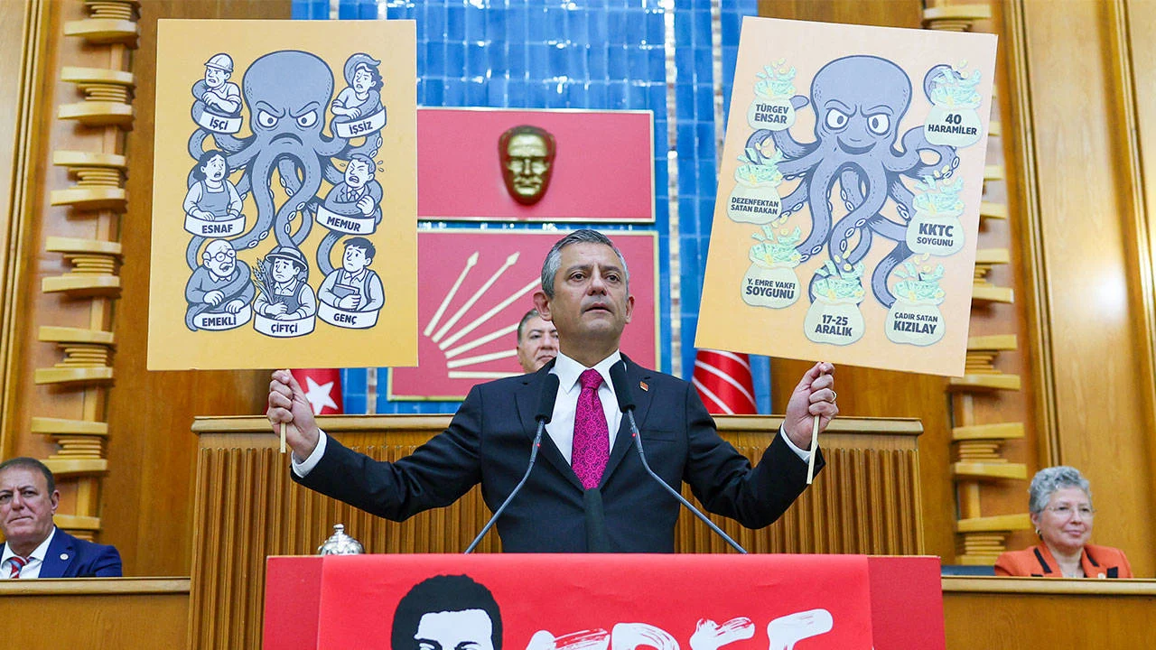 CHP Genel Başkanı Özgür Özel, partisinin grup toplantısında Tayyip Erdoğan’ın “Uluslararası ayağı olan kolları Anadolu’ya uzanan ahtapot tipinde bir suç örgütü ortaya çıktı” sözlerine ahtapot görselleriyle yanıt verip AKP’li belediyelerdeki Sayıştay raporlarına yansıyan usulsüzlükleri saydı