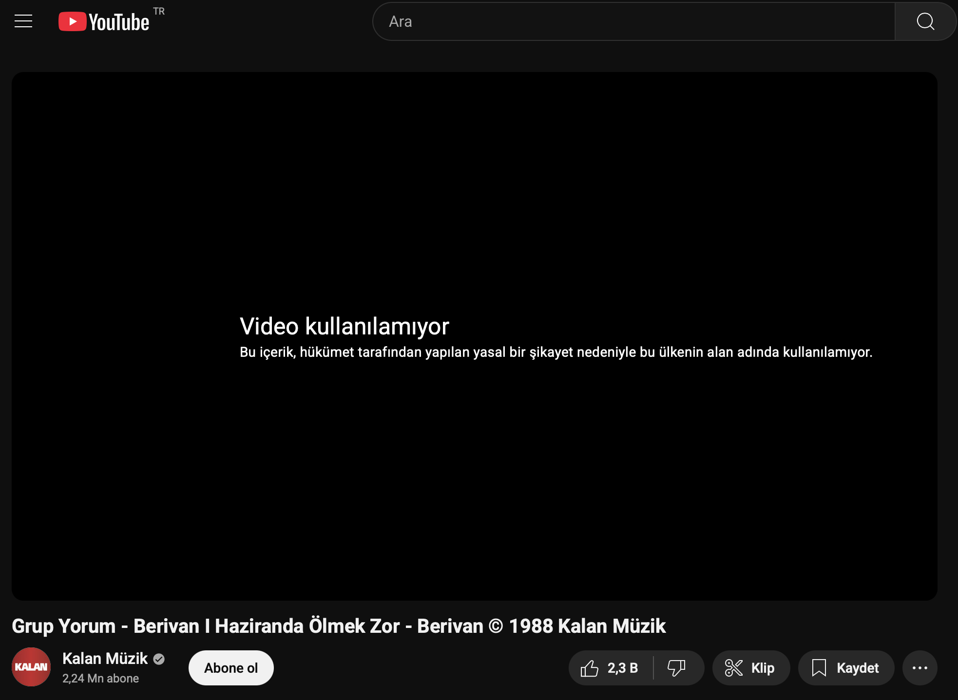 Sosyal medya platformu YouTube, Grup Yorum şarkılarına Türkiye’de erişim engeli getirdi. Müzik şirketi Kalan Müzik’in ve çeşitli platform kullanıcılarının paylaştığı Grup Yorum müzikleri “Bu içerik, hükümet tarafından yapılan yasal bir şikayet nedeniyle bu ülkenin alan adında kullanılamıyor” ibaresiyle Türkiye’de erişime engellendi.