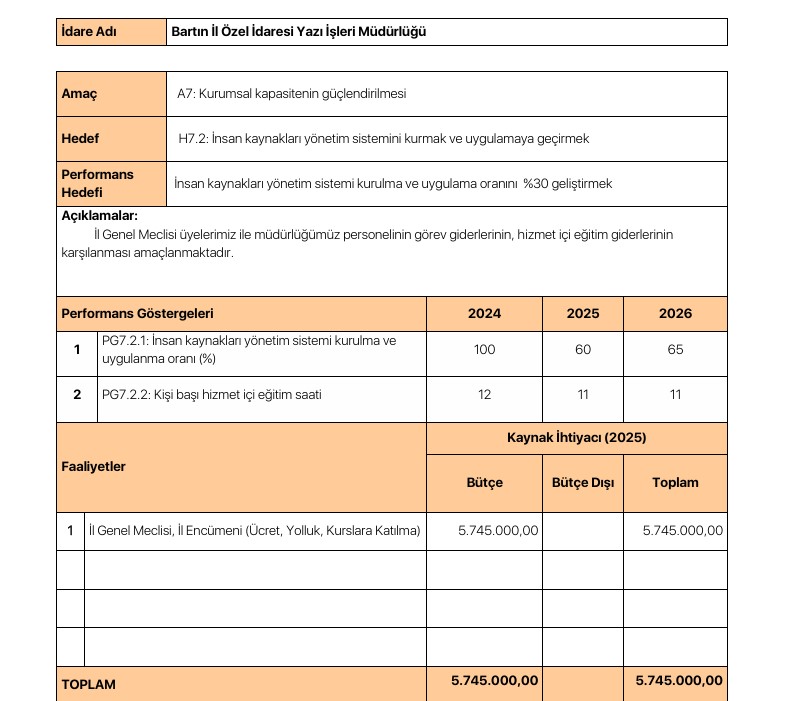 Bartın İl Özel İdaresi’nin 2025 yılı Performans Programı’nın 42. sayfasında yer alan tahsisat nedeniyle. Söz konusu sayfada, İl Genel Meclisi üyeleri ile müdürlük personelinin görev giderleri ve hizmet içi eğitim giderlerinin karşılanması amacıyla; İl Genel Meclisi ve İl Encümeni için toplam 5.745.000 TL (yaklaşık 145.000 dolar) ayrıldığı belirtilmiş.