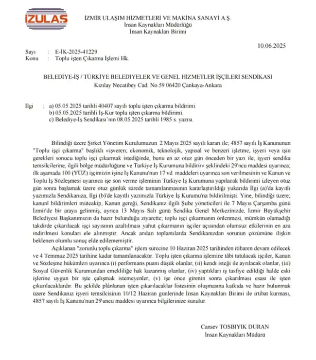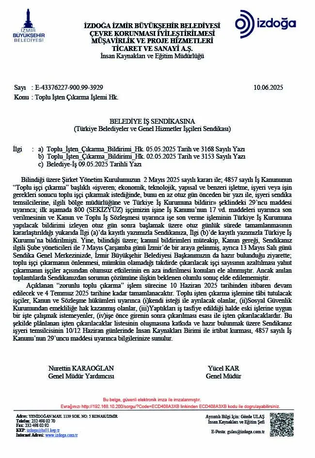 İzmir Büyükşehir Belediyesi, Belediye-İş sendikasına gönderdiği resmi yazıyla belediye bünyesindeki İZDOĞA’dan 800 ve İZULAŞ’tan 100 kişinin işten çıkarılacağını bildirdi