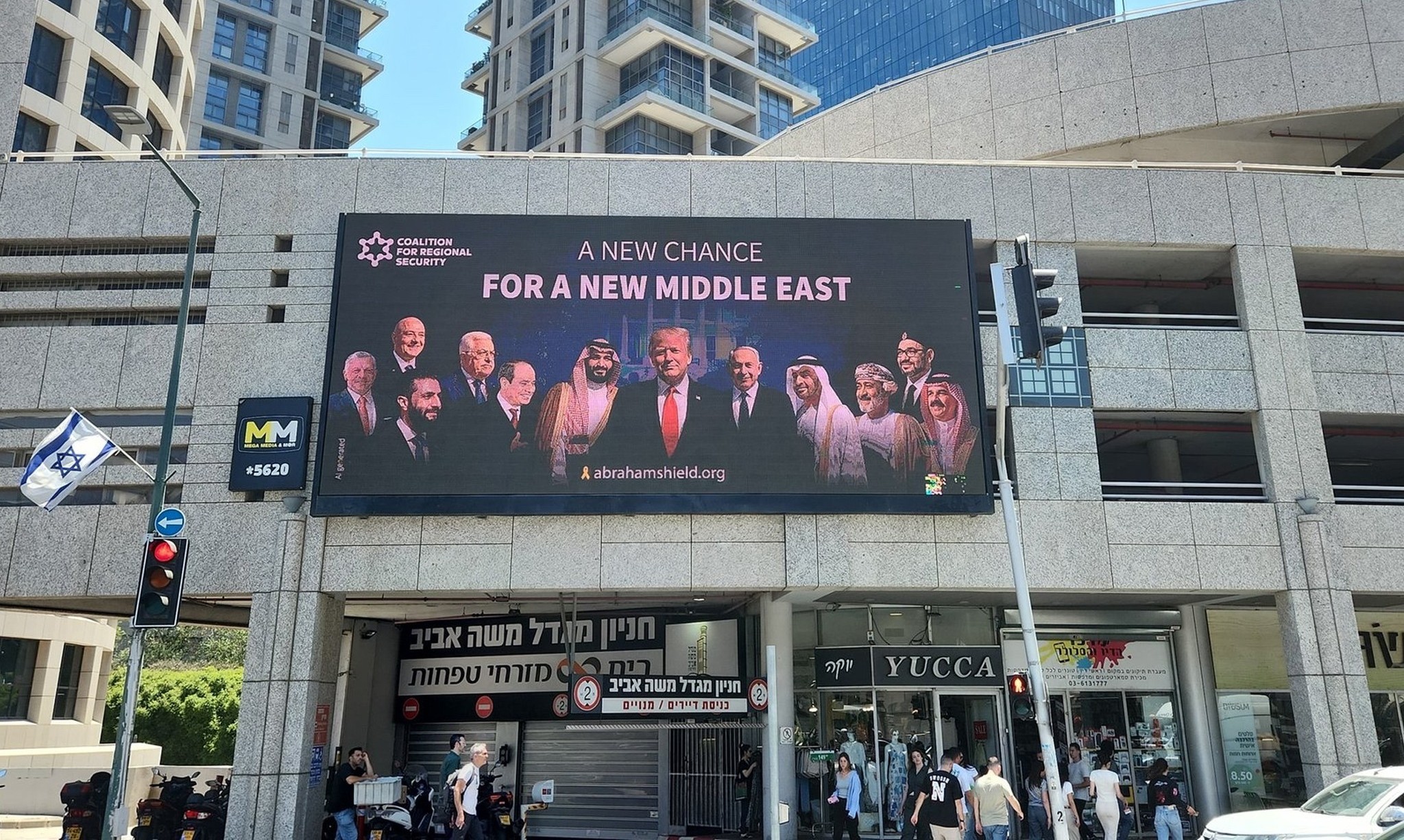 Trump’ın yol haritasına uygun bir afiş Tel Aviv’de reklam panolarına çıktı. Afişteki slogan; “Yeni Bir Ortadoğu’nun Zamanı Geldi!”