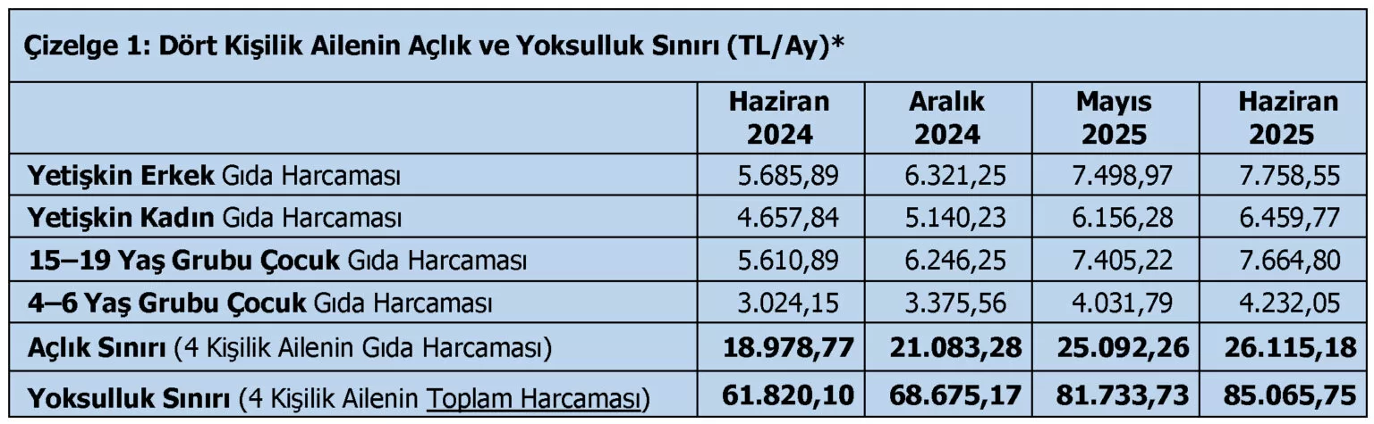 Türk-İş’in verilerine göre 2025 Haziran’da dört kişilik bir hane için açlık sınırı 26.115,18 TL, yoksulluk sınırı ise 85.065,75 TL