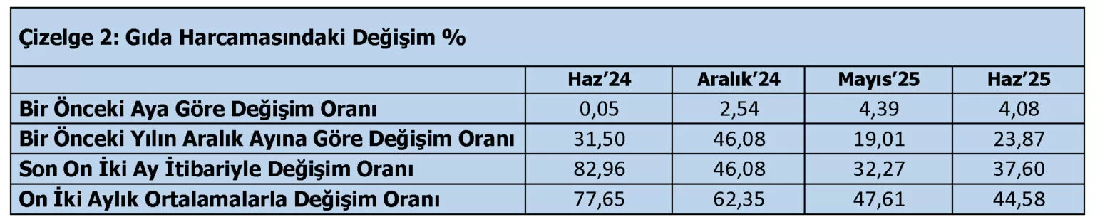 Türk-İş’in verilerine göre “mutfak enflasyonu” verilerindeki değişim Haziran 2025 itibariyle şu şekilde gerçekleşmiştir:
