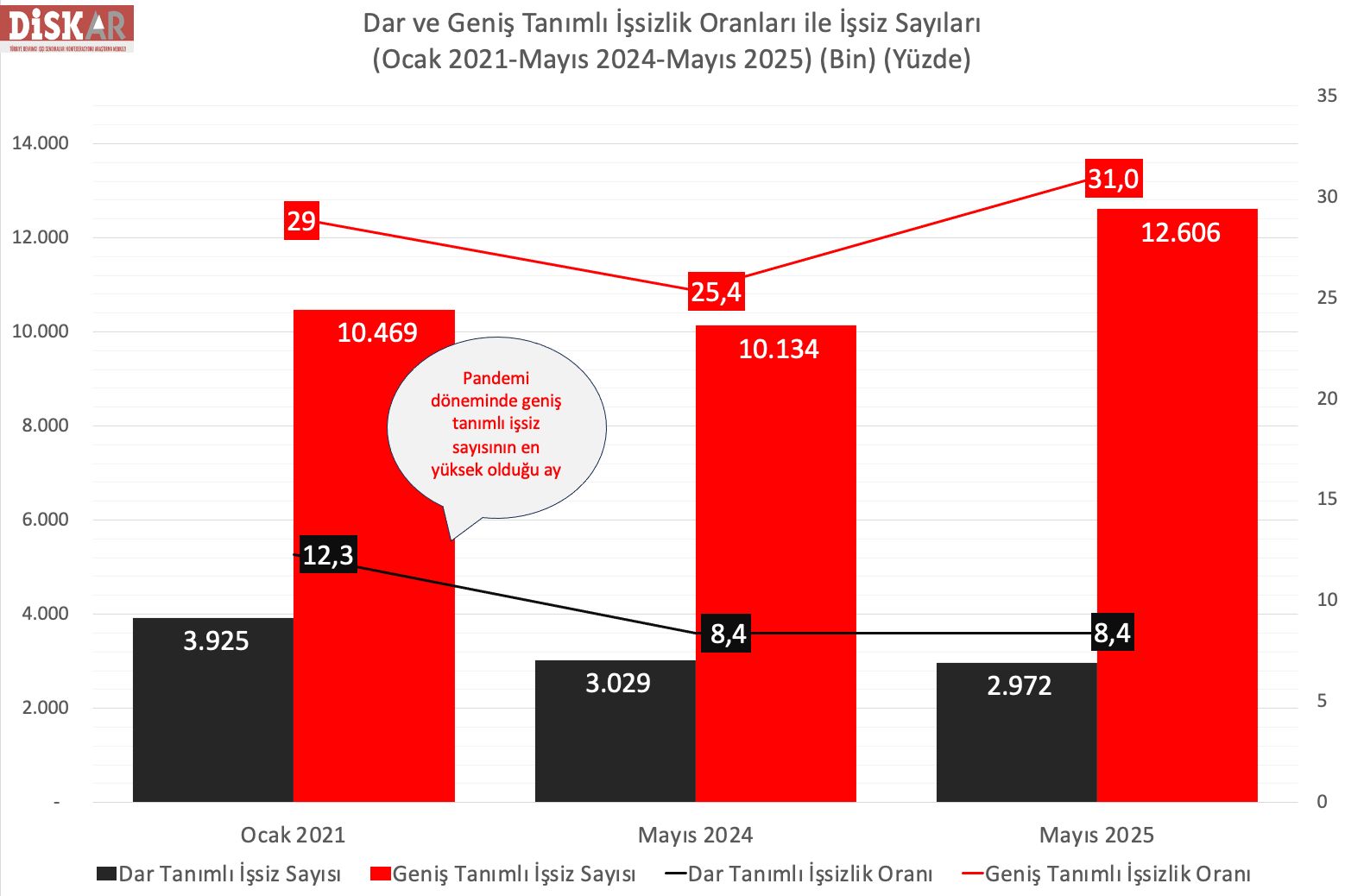 Geniş tanımlı işsizlik oranı yüzde 31 oldu. DİSK-AR son iki ayın işsizlik açısından son 137 ayın en kötü iki ayı olduğunu açıkladı