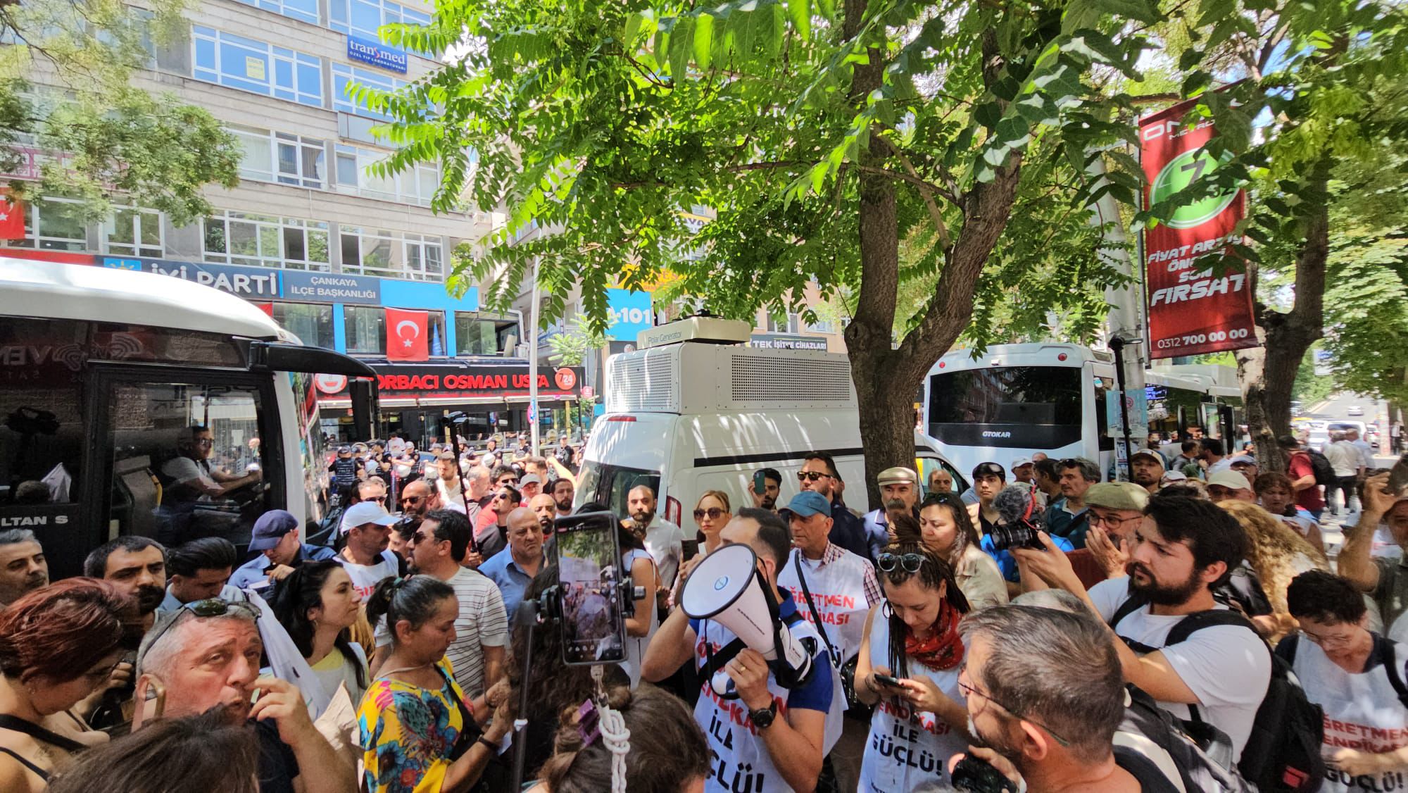 Öğretmenler boyun eğmeyecek. Öğretmenler sessiz kalmayacak. Öğretmenler haklarını alacak. Gözaltından çıkan arkadaşlarımız buraya gelene kadar alanlardan ayrılmayacağız. Yaşasın mücadelemiz.