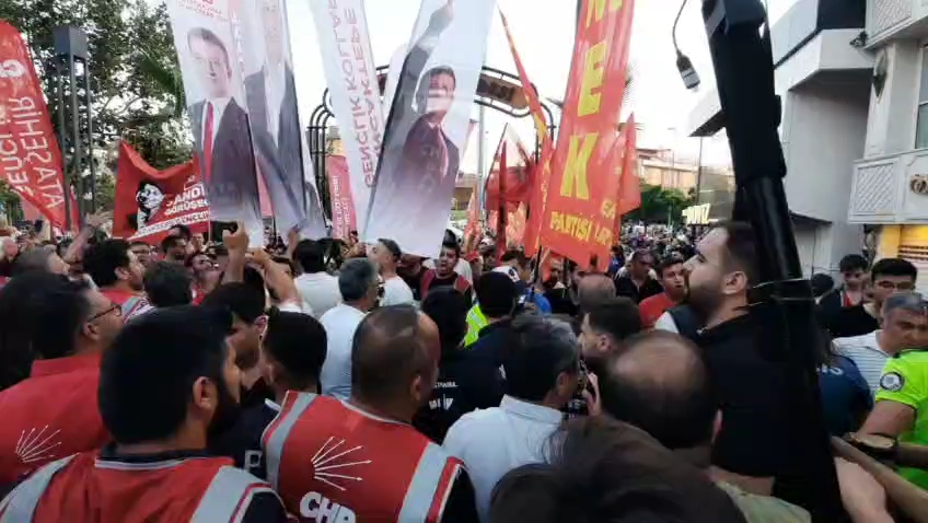 Sarıgazi Demokrasi Caddesi’nde miting için kurulan alana yürüyen gruplardan birinin elindeki Ekrem İmamoğlu’nun tutsaklığına itiraz eden pankart polis saldırısıyla karşılaştı. Polisin pankartı taşıyanlara saldırısı miting katılımcıları tarafından püskürtüldü.