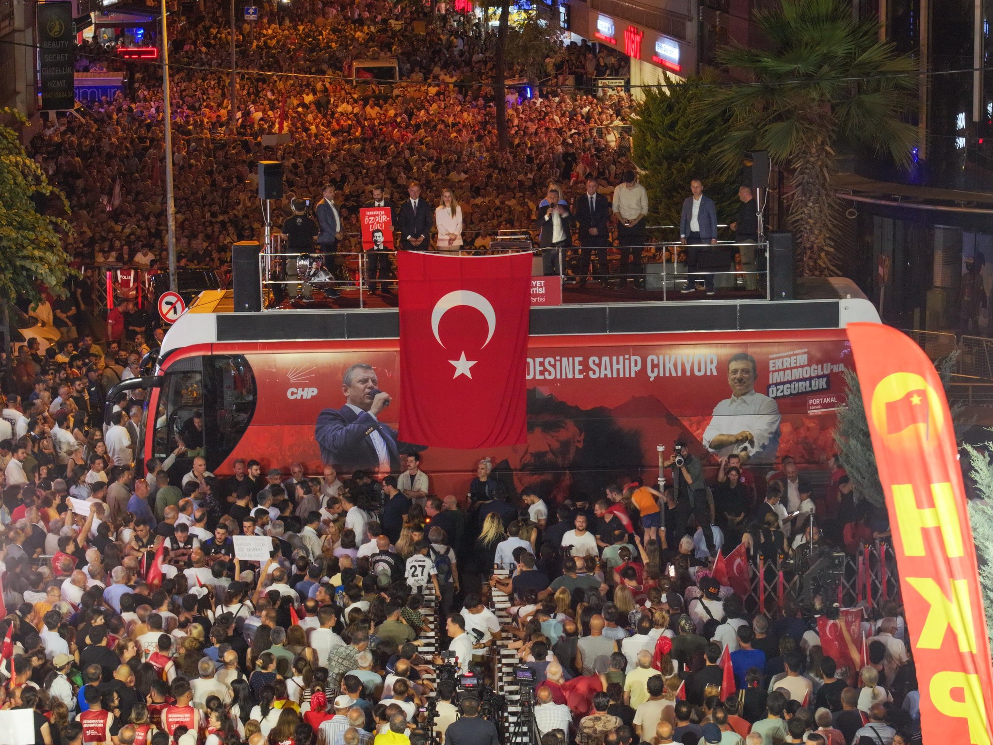 CHP İstanbul İl Başkanı Özgür Çelik, “Karşımızda tükenmiş bir iktidar var. Tüm muhalefeti susturmak istiyorlar, Ayşe Barım’ı tutukladılar, sanatçılar konuşmasın istiyorlar. Sözcü TV’yi kararttılar medyaya gözdağı veriyorlar. Öğrencileri tutukluyorlar, öğrenciler konuşmasın istiyorlar. Milletvekillerine, parti yöneticilerini susturmaya çalışıyorlar. Amaçları Türkiye’nin gerçek gündemlerinin üstünü örtmek. İstiyorlar ki bu ülkede gelir adaletsizliği konuşulmasın, çevre katliamları konuşulmasın, ekonomi, güvenlik konuşulmasın. Cumhuriyet Halk Partisi’ni 360 derece kuşatma altına alıyorlar. İstiyorlar ki CHP’siz bir muhalefet olsun, sandık sembolik olsun” diye konuştu. Çelik, “Sayın İmamoğlu Silivri’deki hücresinde gücünü sizlerden alıyor, dimdik ayakta duruyor” dedi.