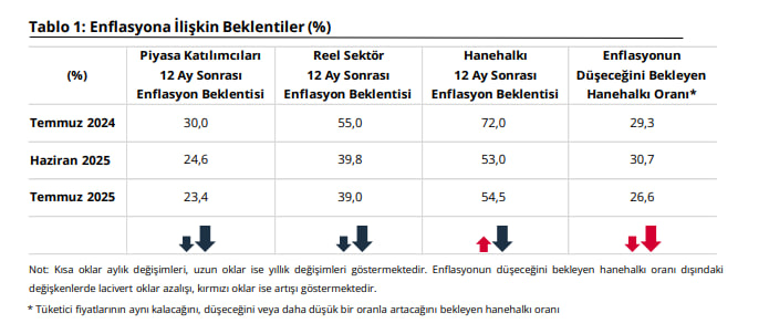 Temmuz ayında 12 ay sonrası yıllık enflasyon beklentileri bir önceki aya göre, piyasa katılımcıları için 1,2 puan azalarak yüzde 23,4 seviyesine, reel sektör için 0,8 puan azalarak yüzde 39 seviyesine gerilerken, hanehalkı için 1,5 puan artarak yüzde 54,5 seviyesine yükseldi.