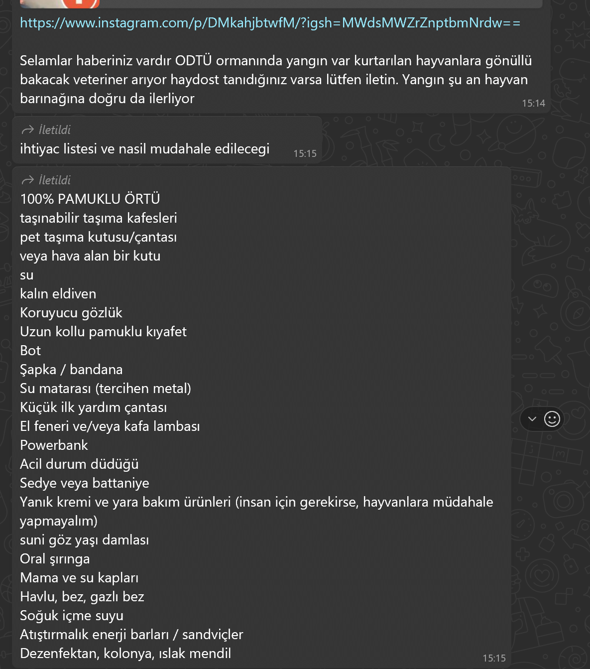 ODTÜ ormanındaki yangının hayvan barınağına doğru ilerlediği aktarıldı. ODTÜ Haydost, yangından etkilenen hayvanlar için bir ihtiyaç listesi yayımladı.