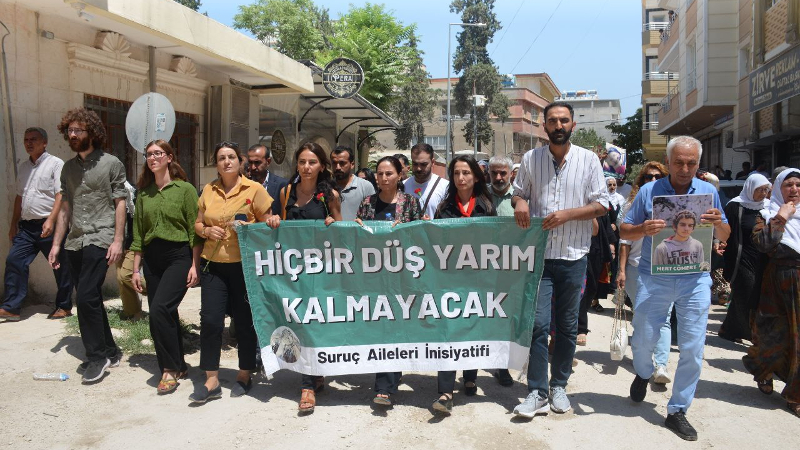 Kitle, Suruç Aileleri İnisiyatifi’nin “Hiçbir düş yarım kalmayacak” pankartı, zılgıt ve sloganlarla Amara Kültür Merkezi’ne doğru yürüyüşe geçti.