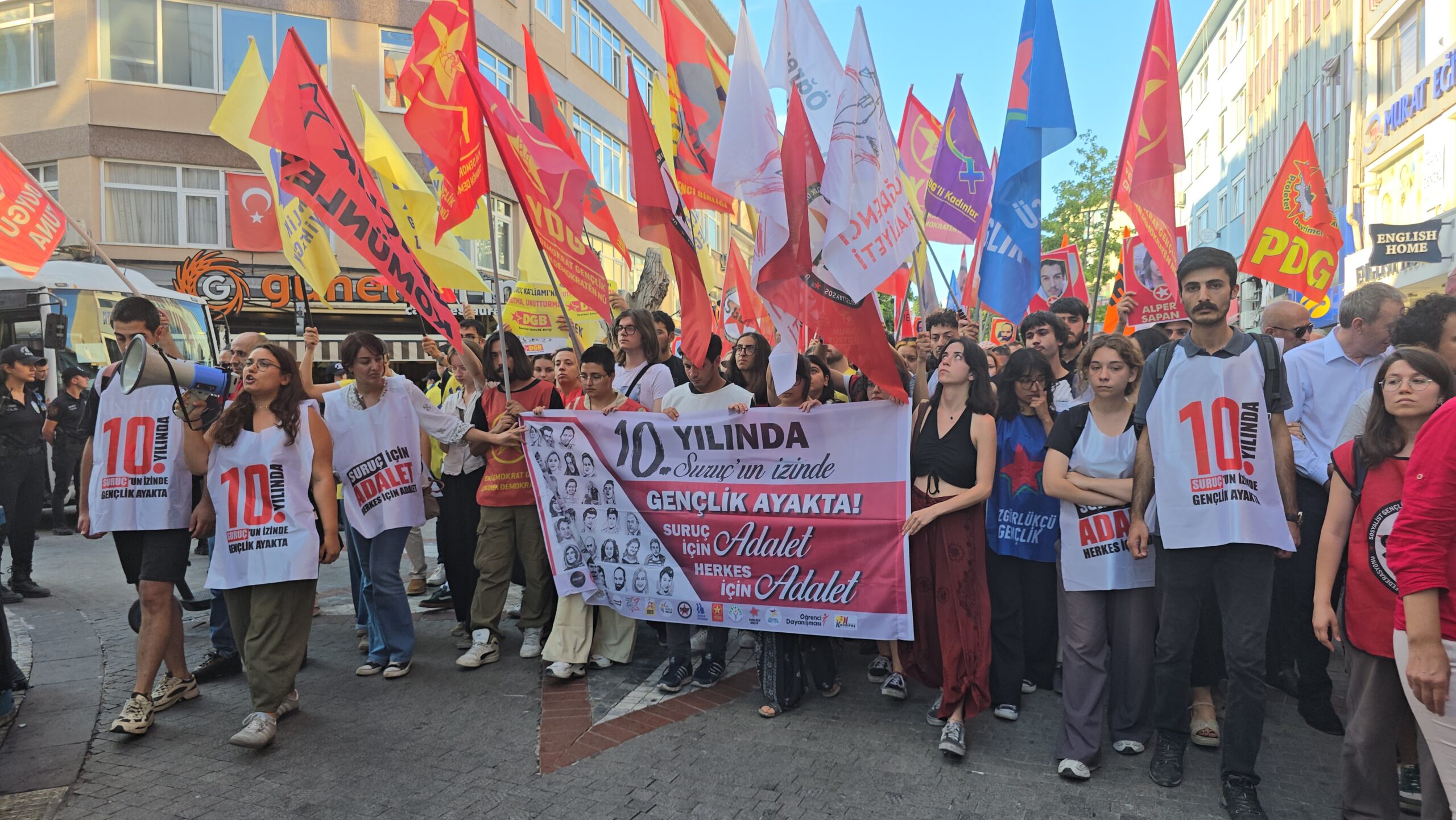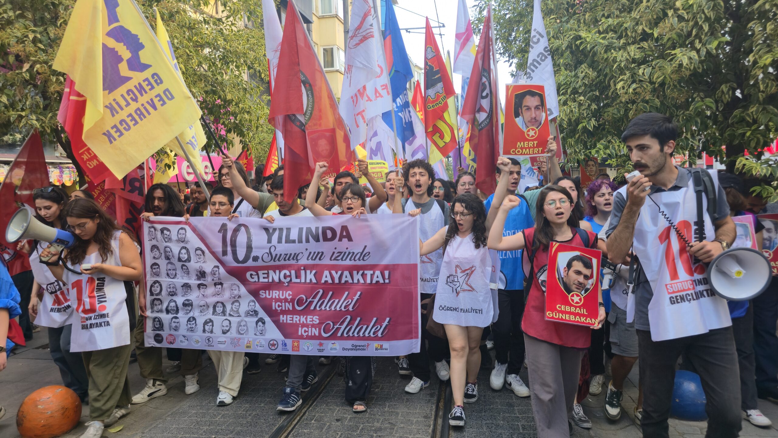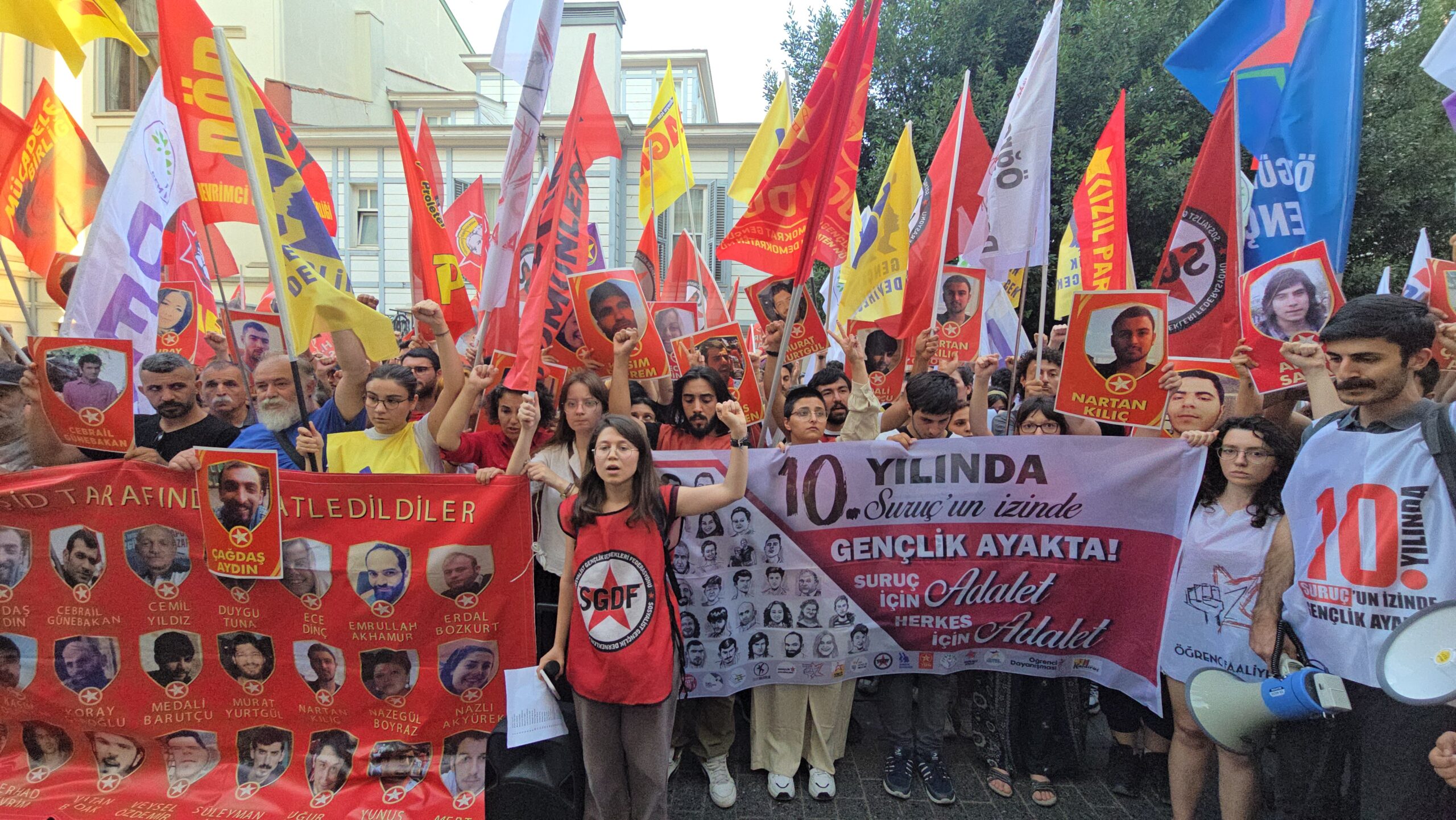 Suruç Aileleri İnisiyatifi’nin çağrısıyla Suruç Katliamı’nın 10. yılında Kadıköy’de Halitağa Caddesi’nde düzenlenen oturma eylemine yoğun polis ablukasına rağmen çok sayıda kişi katıldı. Katliamın 10. yıldönümünde “Suruç için adalet” talebi bir kez daha dile getirildi. Halitağa Caddesi’ndeki oturma eyleminden sonra gençlik örgütlerinin öncülüğünde Süreyya Operası’na doğru yürüyüşe geçildi. Süreyya Operası’nda da gençlik örgütlerinin basın açıklaması yapıldı. Sloganlarla eylem sonlandırıldı