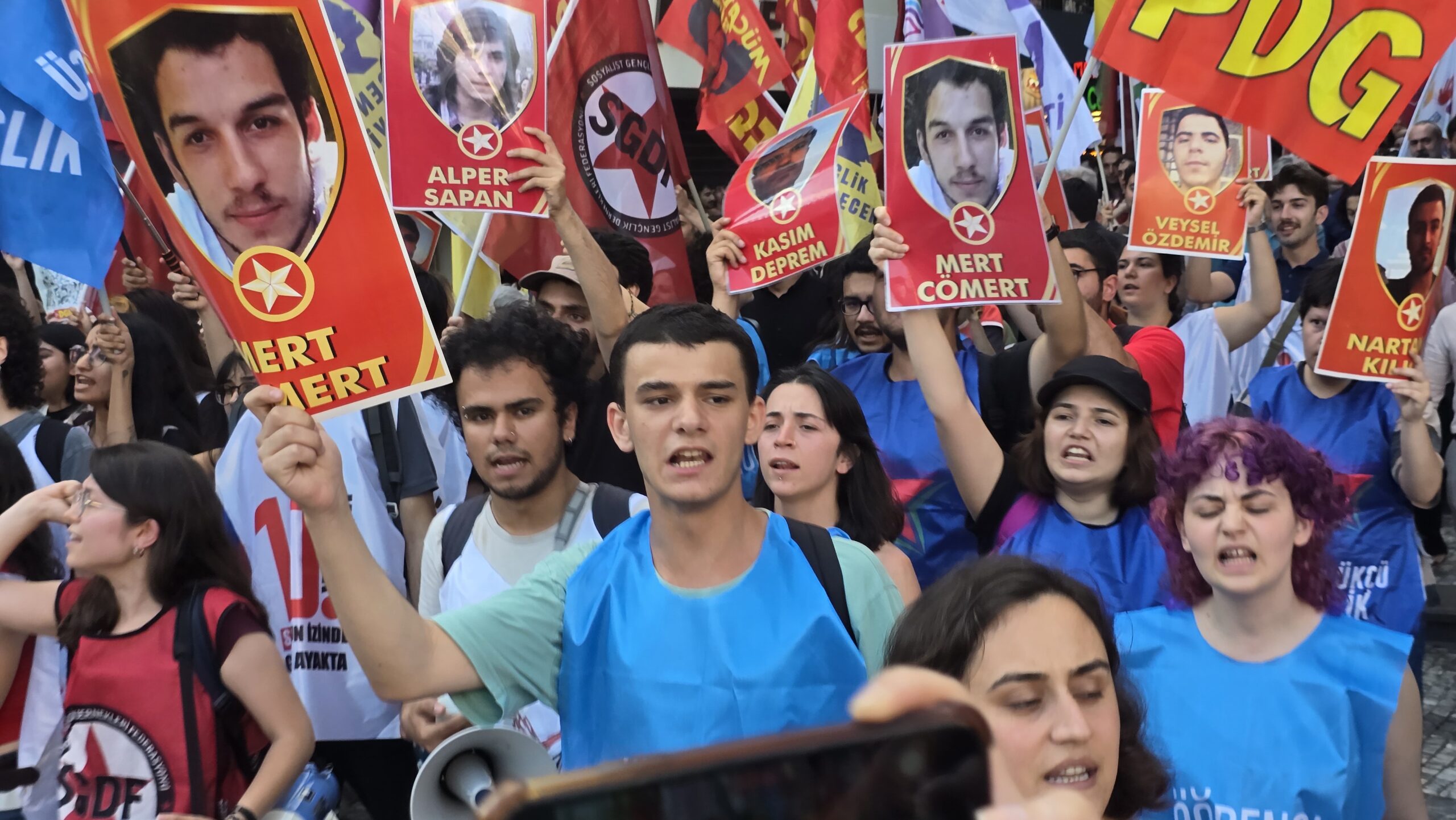 “Kalplerimiz adalet için atsın” yazılı bir pankart açan eylemciler, katliamda yaşamını yitiren 33 düş yolcusunun fotoğraflarını taşıdı.