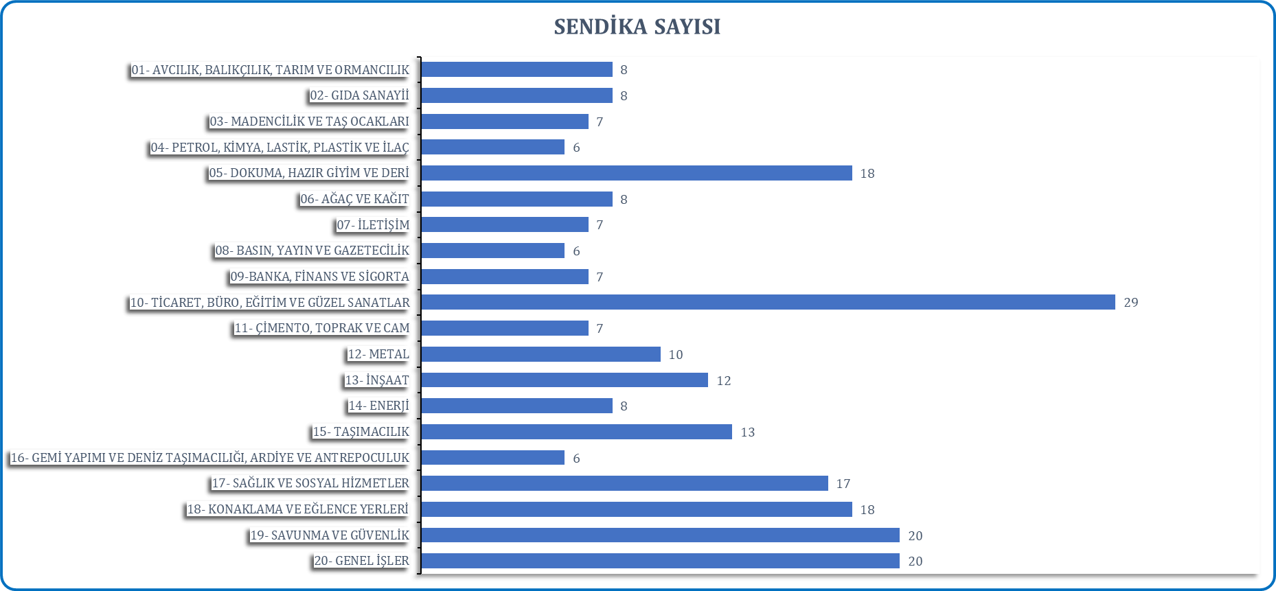 Sendika üyesi işçilerde azalma yaşanırken, sendikaların sayısında genelde bir değişiklik olmadı. Tüm işkollarındaki istatistiğe giren sendika sayısı 235 olarak açıklandı. Bu sendikaların işkollarına göre dağılımına bakıldığında en fazla sendikanın bulunduğu işkolları; ticaret (29), savunma ve genel işler (20), dokuma ve konaklama (18) ve sağlık (17).