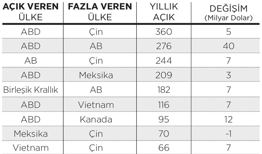2025 birinci çeyrek sonu itibarıyla ülkeler arasındaki ikili ticarete göz atınca; en büyük açığı Çin karşısında, gümrük vergileri yürürlüğe girmeden hızlanan ihracatın etkisiyle ABD’nin verdiğini görüyoruz. ABD’nin Çin’e yıllık dış ticaret açığı 5 milyar dolar artışla, 360 milyar dolara ulaşıyor. En belirgin sıçrama ise, ABD’nin AB karşısındaki açığının 40 milyar dolarlık ivmelenmeyle 276 milyar dolara ulaşması sonucu gözleniyor.