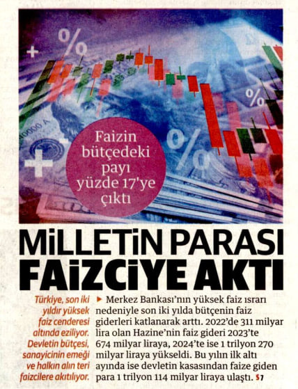 Albayrak grubuna ait Yeni Şafak gazetesi, Mehmet Şimşek öncülüğündeki ekonomi yönetimini vurmaya devam ediyor. Merkez Bankası’nın faiz kararını açıklayacağı gün, gazete birinci sayfasında “Milletin parası faizciye aktı” başlıklı bir haberle çıktı.