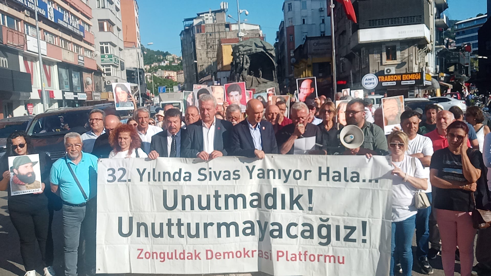 Sivas Madımak Katliamı’nın 32. yılında katliamı lanetlemek ve katledilenler Zonguldak’ta anıldı. Zonguldak Demokrasi Platformu’nun çağrısıyla Madenci Anıtı önünde bir basın açıklaması yapıldı. Açıklamanın ardından Gazipaşa Caddesi üzerinden Maden Mühendisleri Odası Zonguldak Şubesi Lokali’ne yüründü. Polis yürüyüşe engel olmak istese de Zonguldaklılar alkışlarla yürüyüşlerini tamamladı.