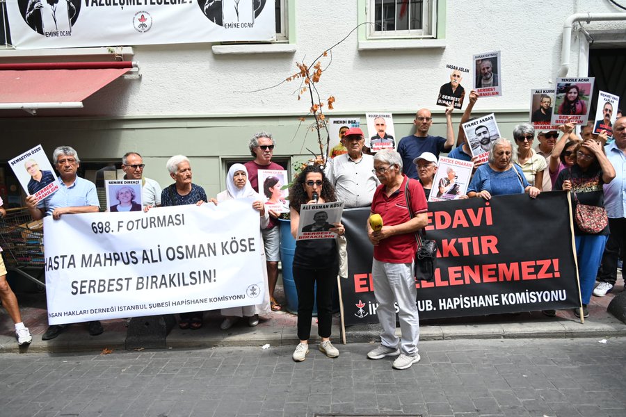 Açıklamada avukatı Seda Şaraldı söz aldı. Seraldı; avukat görüşüne tekerlekli sandalye ile gelebilen Ali Osman Köse’nin, 2020 yılında yapmış olduğu açlık grevinin 8. gününden sonrasını hatırlamadığını, bu açlık grevi nedeniyle pek çok sağlık sorunu yaşadığını, hafıza kaybı, yürüme zorluğu, konuşma bozukluğu, denge sorunu gibi gözle görünen sorunların yanında nörolojik rahatsızlıklar da yaşadığını, bu rahatsızlıklarının tespiti için Tekirdağ Devlet Hastanesine, Namık Kemal Üniversitesi Sağlık Kuruluna ve Adli Tıp Kurumuna sevk edildiğini, buralarda pek çok kere muayene edildiğini ve hakkında “hapishanede kalabilir” şeklinde raporların düzenlendiğini, ancak bu raporların gerçeği yansıtmadığını, müvekkilinin tek başına yaşamsal ihtiyaçlarını gideremeyecek durumda olduğunu, desteksiz 5 metre yürüyemediğinin raporlanmış olduğunu, ancak Adli Tıp Kurumu’nun hiçbir bilimsel araştırma yapmadan ayakta duramama halinin simülatif olduğuna kanaat getirdiğini, ATK muayenesinin ardından Tekirdağ Devlet Hastanesi’nde yapılan böbrek muayenesi sonucu böbreğinde 9 santimetre çapında bir kist tespit edildiğini, tetkikler sonucu bu kistin kanserli olduğunun belirlendiğini, Köse’nin kanserli böbreğinin 2021 yılında ameliyatla alındığını, ancak düzenli tedavi ve takip uygulanmadığını, bu nedenle kanserin yayılma durumunun bilinmediğini, tedavi maksadıyla infazının ertelenerek serbest bırakılması yönündeki talep doğrultusunda gönderildiği Adli Tıp Kurumunun ise, Ali Osman Köse için hapishanede kalabilir raporu vererek, yaşam hakkına yönelik tehdidin daha da ağırlaşmasına neden olduğunu aktardı.
