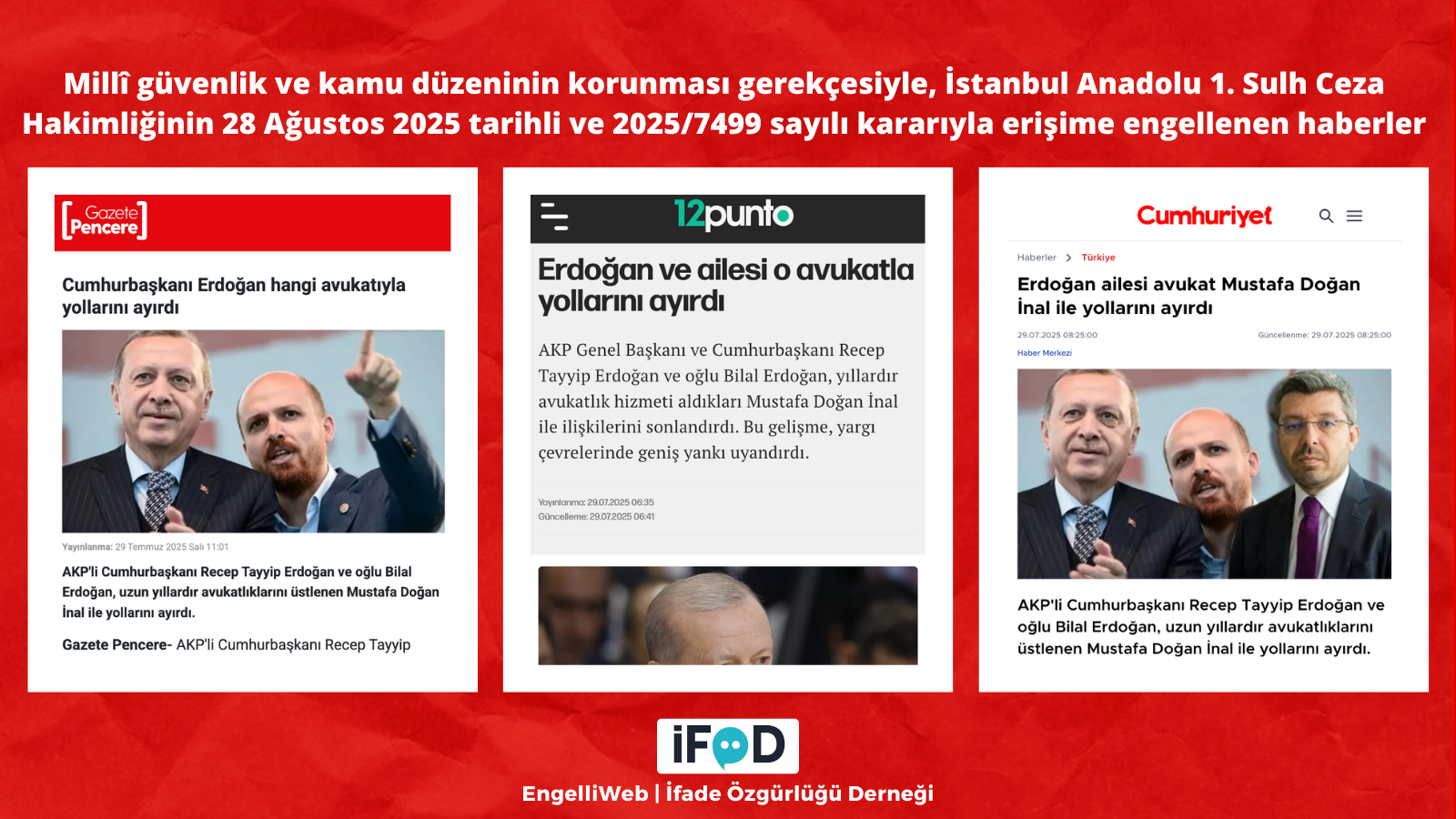 Tayyip Erdoğan ile oğlu Bilal Erdoğan’ın, avukat Mustafa Doğan İnal’a verdikleri vekâletleri sona erdirdiklerine ilişkin haberler, “milli güvenlik ve kamu düzeninin korunması” gerekçesiyle, İstanbul Anadolu 1. Sulh Ceza Hakimliği’nce erişime engellendi.
