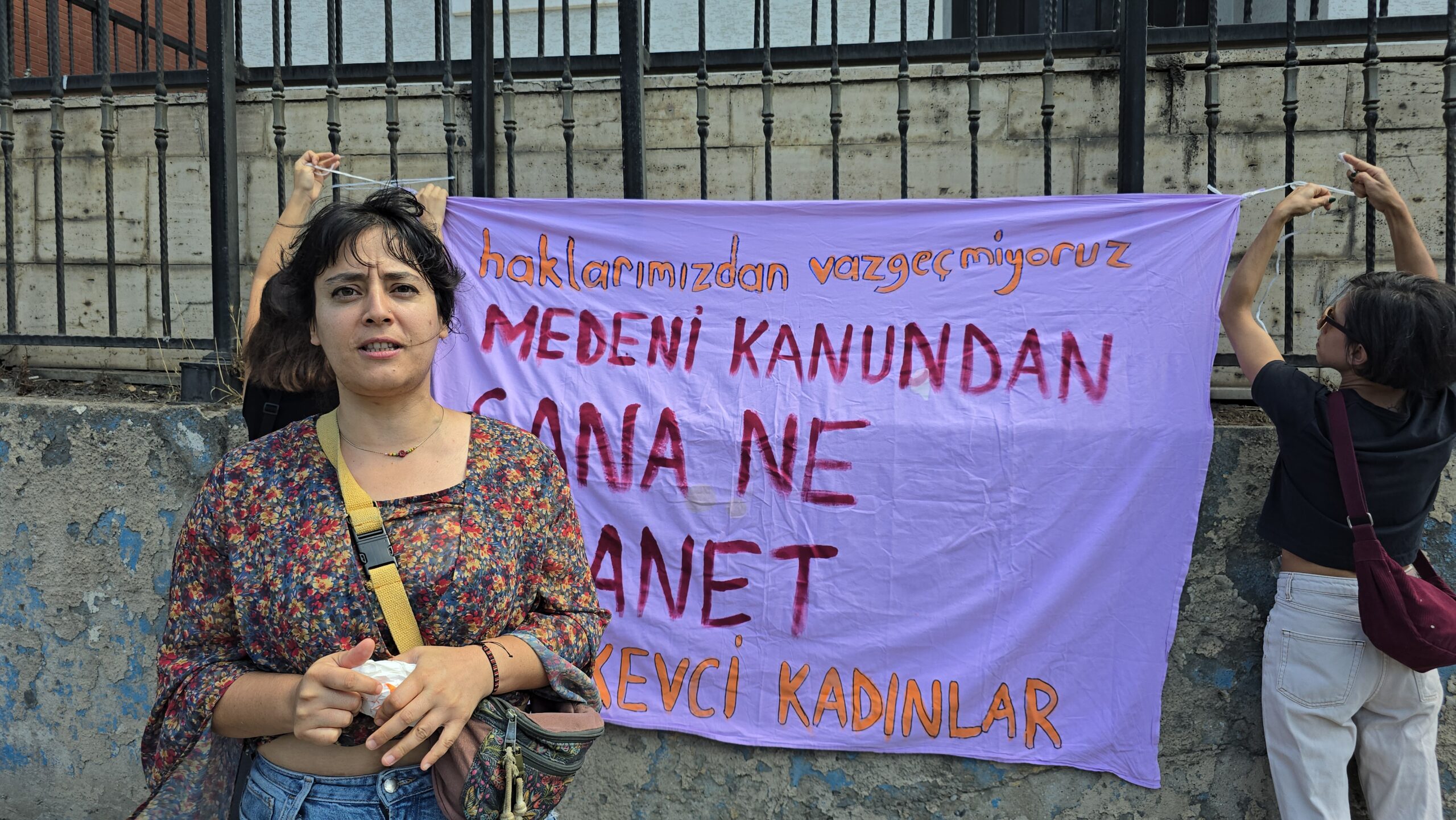 Halkevci Kadınlar, Kadıköy Müftülüğü önüne “Haklarımızdan vazgeçmiyoruz. Medeni Kanun’dan sana ne Diyanet” yazılı bir pankart astı