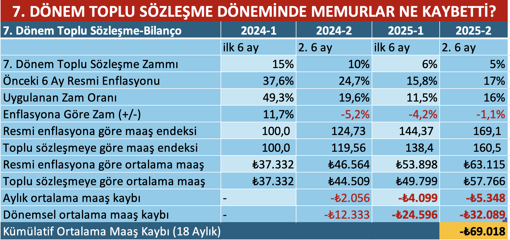 Uygulanan zamlarla birlikte kamu emekçilerinin yaşadığı kaybı, sosyal politikacı Aziz Çelik şu tabloyla gösterdi: