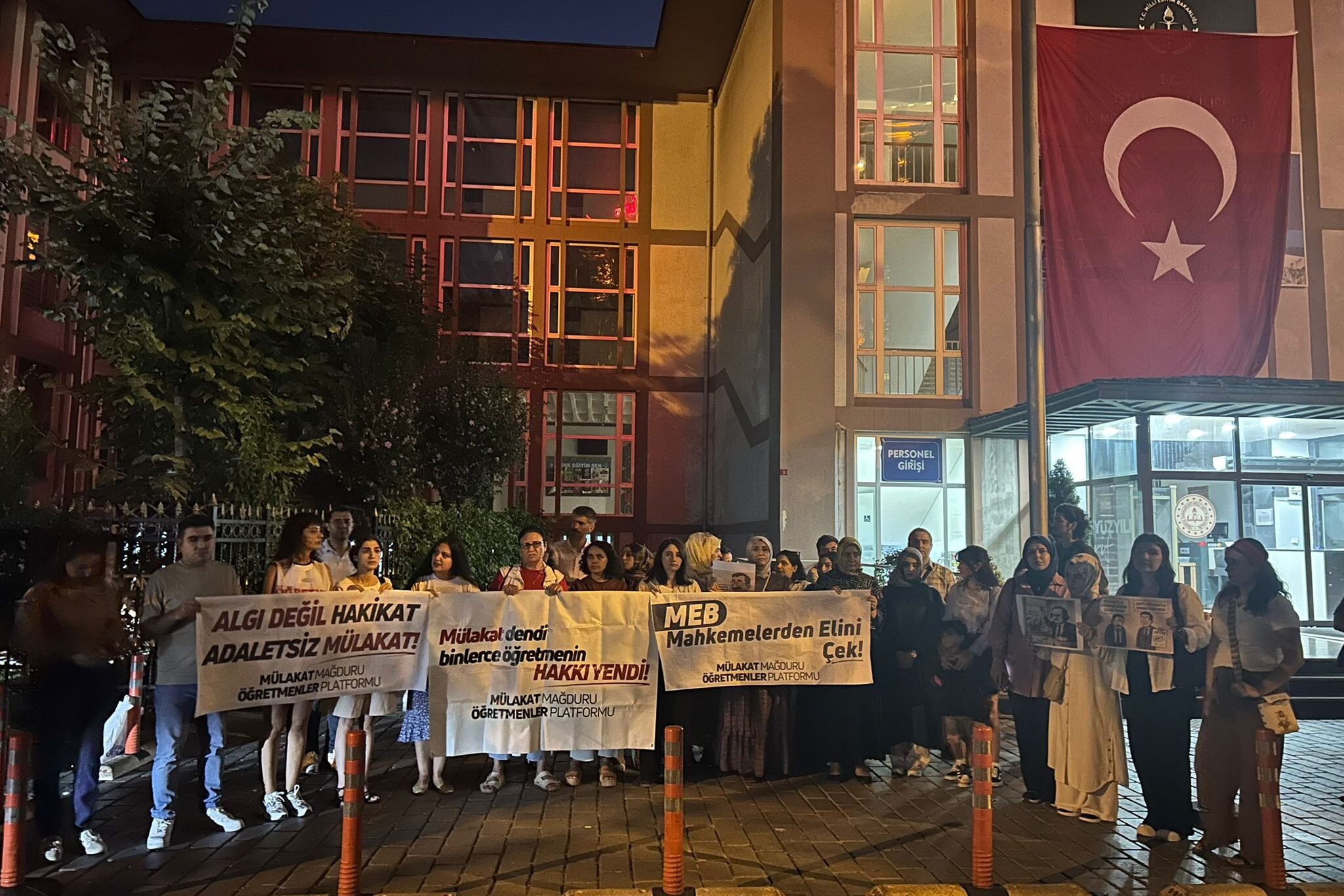 Mülakat Mağduru Öğretmenler, hak arayışlarının 300. gününde MEB Bakanı Yusuf Tekin’e seslendi. İstanbul İl Milli Eğitim Müdürlüğü’nün önünde bir araya gelen öğretmenler, “Algı değil hakikat, adaletsiz mülakat”, “Mülakat dendi, binlerce öğretmenin hakkı yendi”, “MEB elinin öğretmenlerden çek” pankartlarını açarken “Adalet dediniz, kul hakkına girdiniz”, “Erzurum’da girmedik, İstanbul’da elendik”, “Mücadele dersini öğretmenler veriyor” sloganları atıldı.