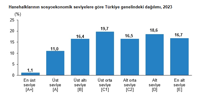 Araştırma kapsamında, sosyoekonomik seviye gruplarına bakıldığında, Türkiye’deki hane halklarının yüzde 1,1’i en üst seviyede, yüzde 11’i üst, yüzde 16,4’ü üst altı, yüzde 19,7’si üst orta, yüzde 16,5’i alt orta, yüzde 18,6’sı alt ve yüzde 16,7’si en alt seviyede.