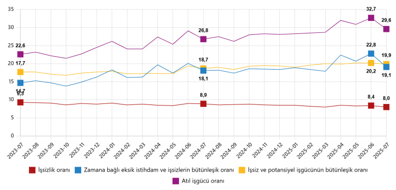 Temmuz 2025 itibarıyla Yaklaşık 700 bin kişi haftalık 40 saatten az çalışıyor ve daha fazla çalışmak istiyor. Türkiye’de 5,3 milyona kişi ise çalışmak istemesine rağmen iş bulamıyor. Yani dar tanımlı işsizlik dışındaki bütün işsizlik türleri yükseliyor.