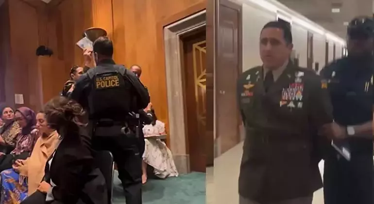 ABD Senatosu’nda dün gerçekleştirilen bir oturum, Gazze’deki savaşa tepki gösteren iki emekli askerin protestosuna sahne oldu. Eski Ordu istihbarat subayı Josephine Guilbeau ve emekli Yarbay Anthony Aguilar, komite üyelerini “soykırıma ortak olmakla” suçladıktan sonra güvenlik güçleri tarafından zorla salondan çıkarıldı ve gözaltına alındı
