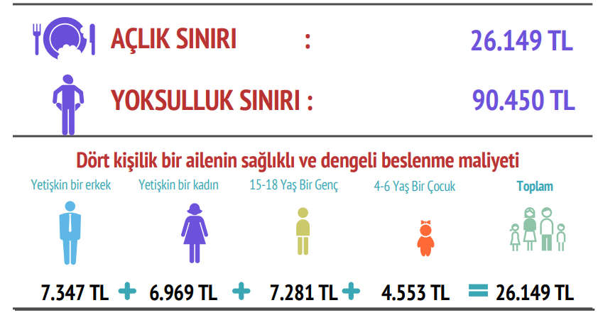 TÜİK (Türkiye İstatistik Kurumu) harcama gruplarına göre endeks rakamları, 2003 yıllı madde fiyatları ile İstanbul Halk Ekmek, zincir market cari ay internet fiyatları ve BİSAM Beslenme Kalıbı üzerinden yapılan hesaplamaya göre dört kişilik bir ailenin sağlıklı ve dengeli beslenmesi için aylık yapması gereken harcama tutarı Ağustos 2025 için 26 bin 149 lira, yoksulluk sınırı 90 bin 450 lira olarak belirlendi.