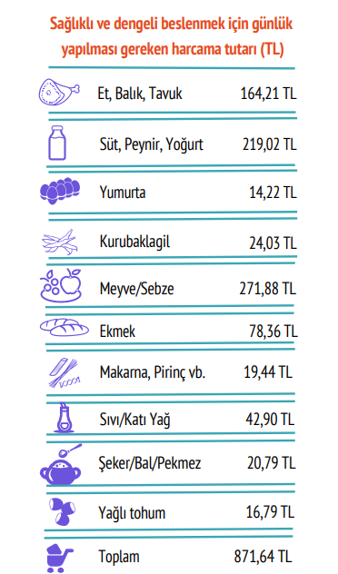 BİSAM’ın araştırmalarına göre yetişkin bir erkeğin sağlıklı ve dengeli beslenmesi için tüketmesi gereken gıdaların aylık karşılığı yedi bin 347, yetişkin bir kadın için altı bin 969, 15-18 yaş genç için yedi bin 281, 4-6 yaş arası çocuk için dört bin 553 lira olduğu belirlendi. Sağlıklı bir biçimde beslenmenin toplam aile bütçesine maliyeti ise 26 bin 149 lira olarak tespit edilirken, eğitim, sağlık, barınma, eğlence, ısınma, ulaşım gibi giderler ile birlikte bir ailenin yapması gereken harcama tutarı 90 bin 450 liraya ulaştığı bilgisine yer verildi. Ayrıca raporda tek başına yaşayan bir kişi için yoksulluk sınırı 42.234 lira olarak kaydedildi.