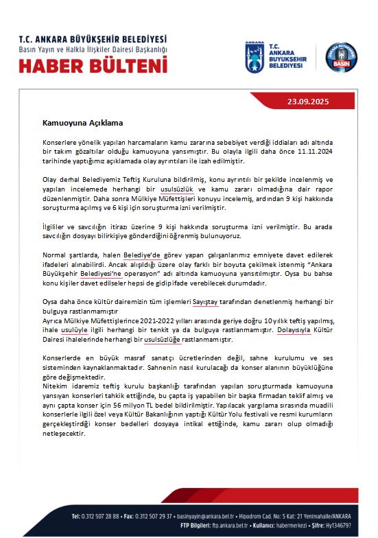 Ankara Cumhuriyet Başsavcılığı, Ankara Büyükşehir Belediye Başkanlığı tarafından “2021–2024 yılları arasında düzenlenen konserlere ilişkin harcamalarda kamu zararına yol açıldığı” iddiaları üzerine soruşturma başlattı.