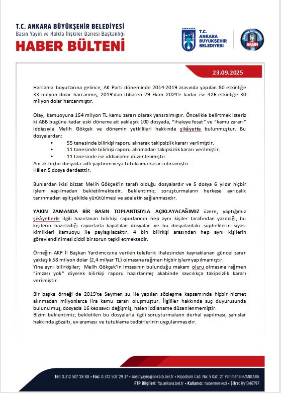Ankara Büyükşehir Belediye Başkanlığı tarafından 2021-2024 yılları arasında düzenlenen konserlere yönelik yapılan harcamaların kamu zararına sebebiyet verdiği iddialarına ilişkin Cumhuriyet Başsavcılığımızca yürütülen soruşturma kapsamında; İçişleri Bakanlığı Mülkiye Müfettişliği tarafından düzenlenen tevdii raporu, MASAK incelemesi, Sayıştay incelemesi, bilirkişi raporlarına göre 32 adet konser hizmet alımında idarenin 154.453.221,60 TL zarara uğratıldığı tespit edilmiştir.