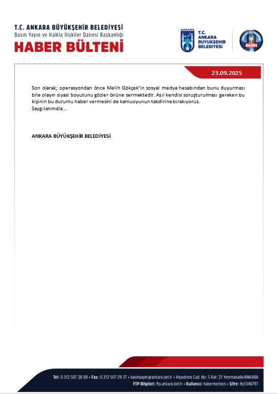 Ankara Büyükşehir Belediyesi, Ankara Cumhuriyet Başsavcılığı’nın belediyeye yönelik yürüttüğü soruşturma kapsamında 13 kişinin gözaltına alınmasına ilişkin açıklama yaptı.