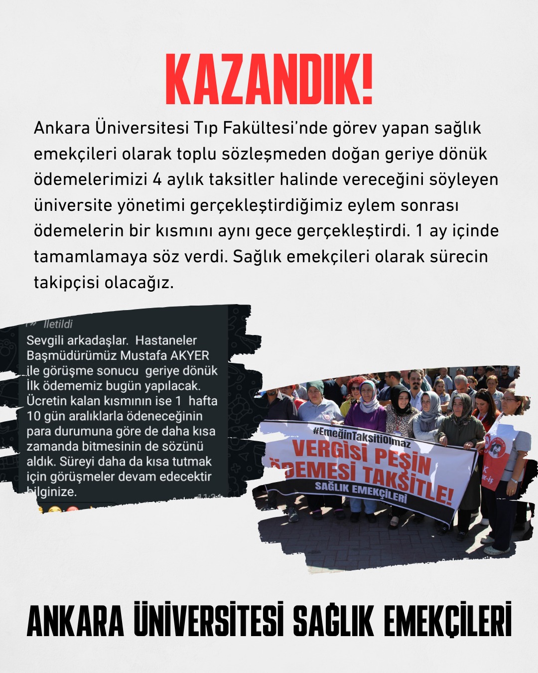 Ankara Üniversitesi’ne bağlı İbni Sina Hastanesi’ndeki sağlık emekçileri toplu sözleşmenin imzalanmasının ardından açığa çıkan geriye dönük alacaklarının eksik yatması üzerine hastane önünde eylem yapmıştı. Sağlık emekçilerinin mücadelesi kazanımla sonuçlandı