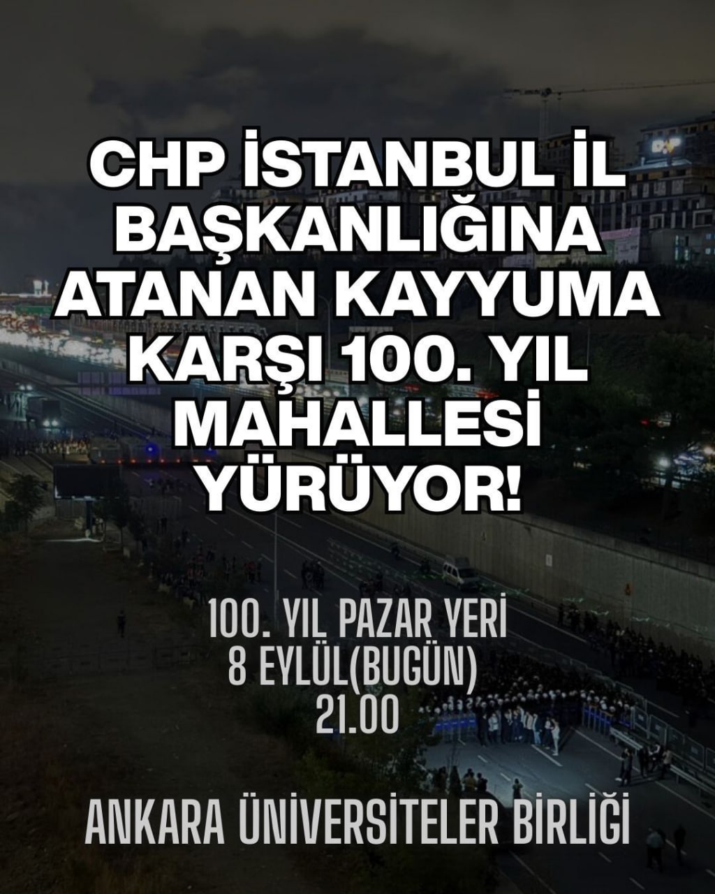 Ankara Üniversiteliler Birliği 8 Eylül Pazartesi günü saat 21.00’da 100. Yıl Pazar Yeri’ne çağrı yaptı.