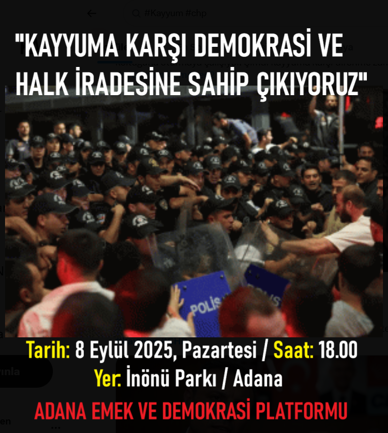 Adana Emek ve Demokrasi Platformu 8 Eylül Pazartesi günü saat 18.00’da İnönü Parkı’na çağrı yaptı.