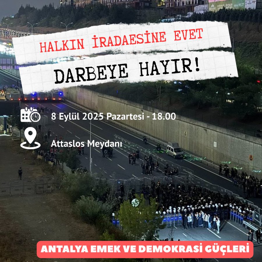 Antalya Emek ve Demokrasi Güçleri 8 Eylül Pazartesi günü 18.00’da Attalos Meydanı’na çağrıda bulundu.