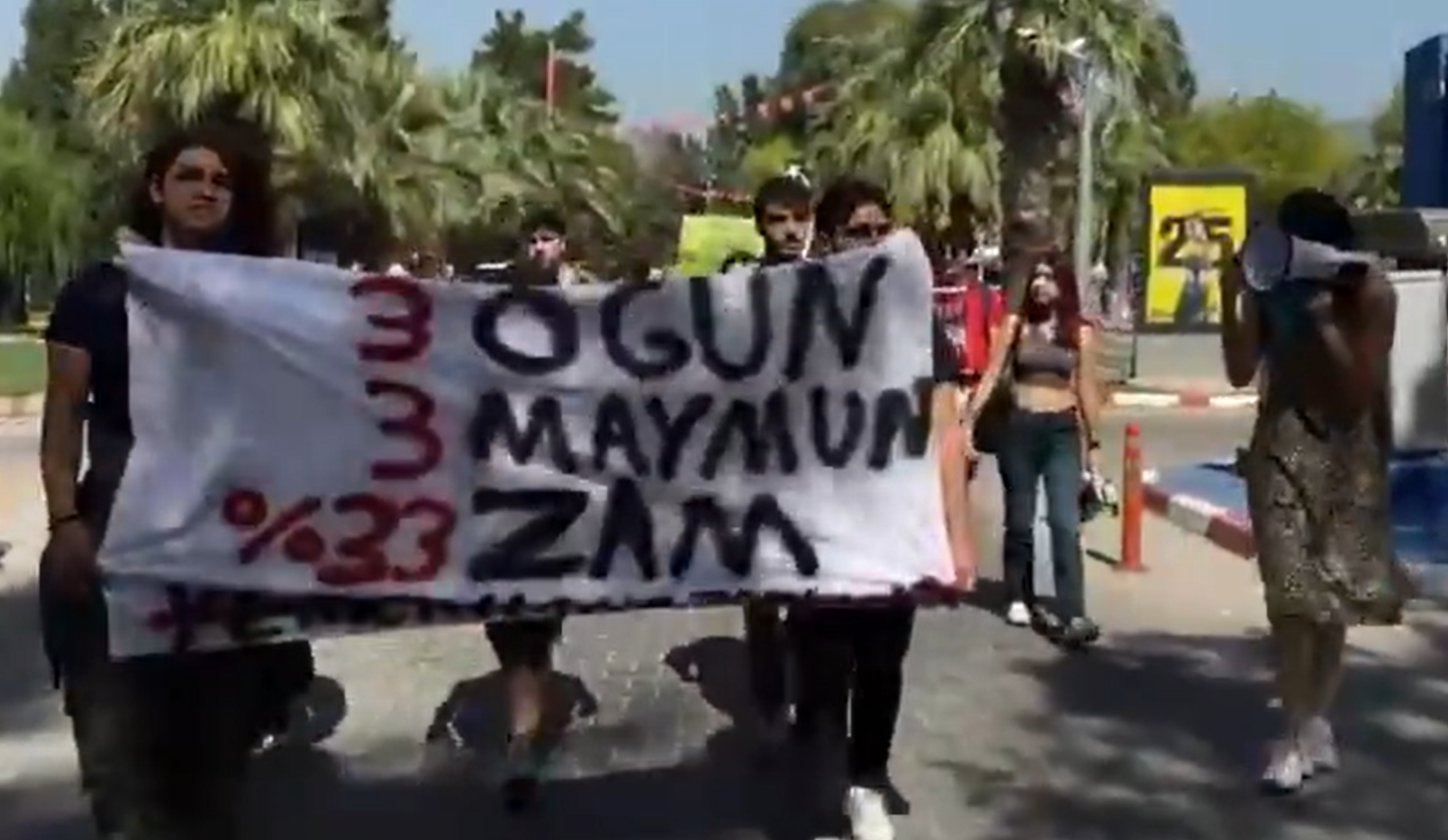 Ege Üniversitesi öğrencileri yemekhanedeki yemeklere gelen yüzde 33’lük zamma önce yemekhanede tepki gösterdi sonra da kampüs içinde yürüyüş düzenledi. Üniversiteliler, üç öğün yemekhane kullanan bir öğrencinin, aylık KYK bursundan 1000 TL daha fazla ödemek zorunda bırakıldığına dikkat çekti.