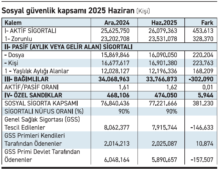 Tüm zorunlu sigortalılar açısından bakıldığında, Haziran 2025 itibariyle emekli olup da çalışanlar dahil, işbaşında fiilen kayıtlı çalışan kişi sayısı 25 milyon 687 bin kişi oldu. Haziran 2024’te ise bu kişi sayısı 25 milyon 228 bin kişi oldu. 156 bin kişiydi. Emekli olup da çalışmaya devam eden kişilerle birlikte çalışan sayısı 2025 Haziran ayı itibariyle bir önceki yıla göre 456.8 bin kişi arttı.
