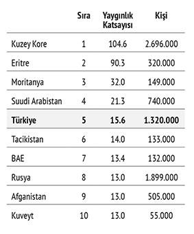 Çalışmada Türkiye de yer almaktadır. Buna göre Türkiye, Avrupa ve Orta Asya’da modern köleliğin en yaygın olduğu ülkedir. Ayrıca bölgede modern köleliğe müdahale etmek için en az adım atan ülkeler arasındadır. 2023 Küresel Kölelik Endeksi, 2021 yılında herhangi bir günde Türkiye’de 1,3 milyon kişinin modern kölelik altında yaşadığını tahmin ediyor. Bu, ülkedeki her bin kişi için 15,6 kişinin modern kölelik koşullarında yaşadığı anlamına geliyor. Türkiye, Avrupa ve Orta Asya’da değerlendirilen 47 ülke arasında en yüksek modern kölelik yaygınlığına sahip ve küresel olarak en yüksek yaygınlığa sahip ülkeler arasında yer alıyor (160’tan 5). Ayrıca bölgede modern kölelik altında yaşayan tahmini toplam insan sayısı bakımından ikinci en yüksek sayıya sahip ve küresel olarak ilk onda yer alıyor. Modern köleliğin en yaygın olduğu tahmin edilen ülkeler sıralaması şöyle: