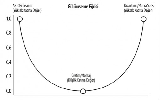 Üretimi ucuz emek bölgelerine taşıyan değer zincirleri burada çok önemli tabi. Meşhur bir eğri var Gülümseme Eğrisi deniyor literatürde. Kabaca, küresel değer zincirinde en düşük katma değerin üretim aşamasında, en yüksek katma değerin ise tasarım/Ar-Ge ve pazarlama/marka aşamalarında toplandığını gösteren bir modeldir. Kenarlarda gelişmiş ülkeler ortada ise az gelişmişler toplanıyor…