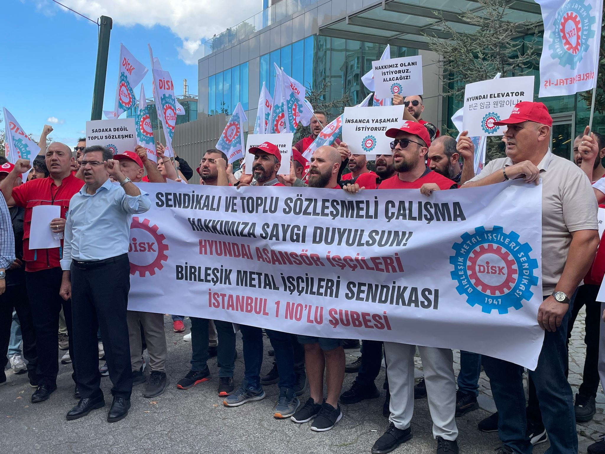 Birleşik Metal-İş’e üye Hyundai Asansör işçileri sendikal hakları ve sefalet ücretine karşı Hyundai Asansör Genel Müdürlüğü önünde eylemdeydi
