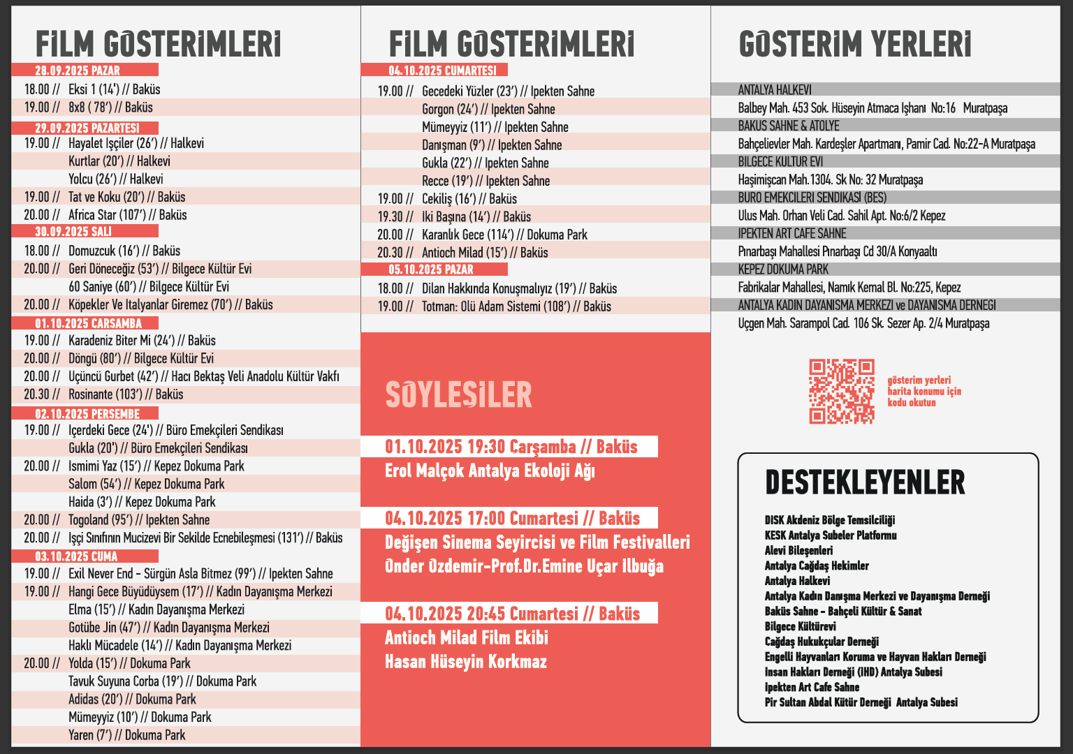 Filmlerimiz Baküs Sahne, Bilgece Kültürevi, İpekten Sahne ile Büro Emekçileri Sendikası (BES) Antalya Şubesi, Antalya Halkevi, Antalya Kadın Danışma Merkezi ve Dayanışma Derneği ile Hacı Bektaş Veli Anadolu Kültür Vakfı salonlarında gösterilecek.